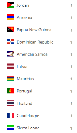 There are 22 countries in which only 1 person has visited the website, the top ten of which are: